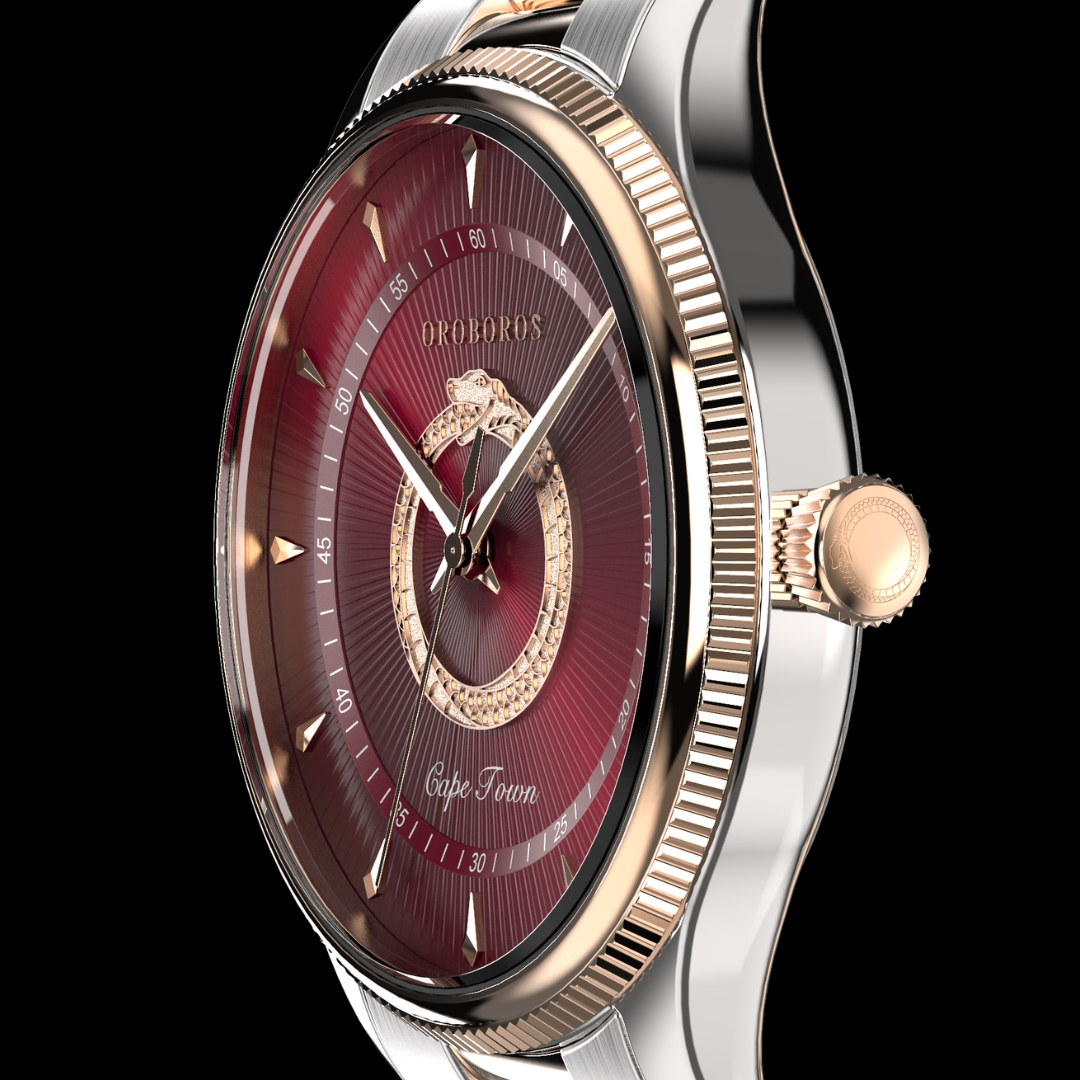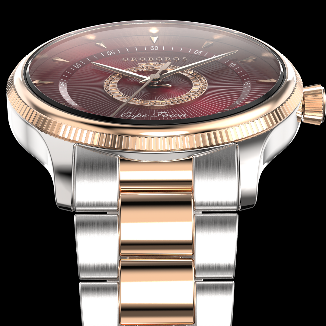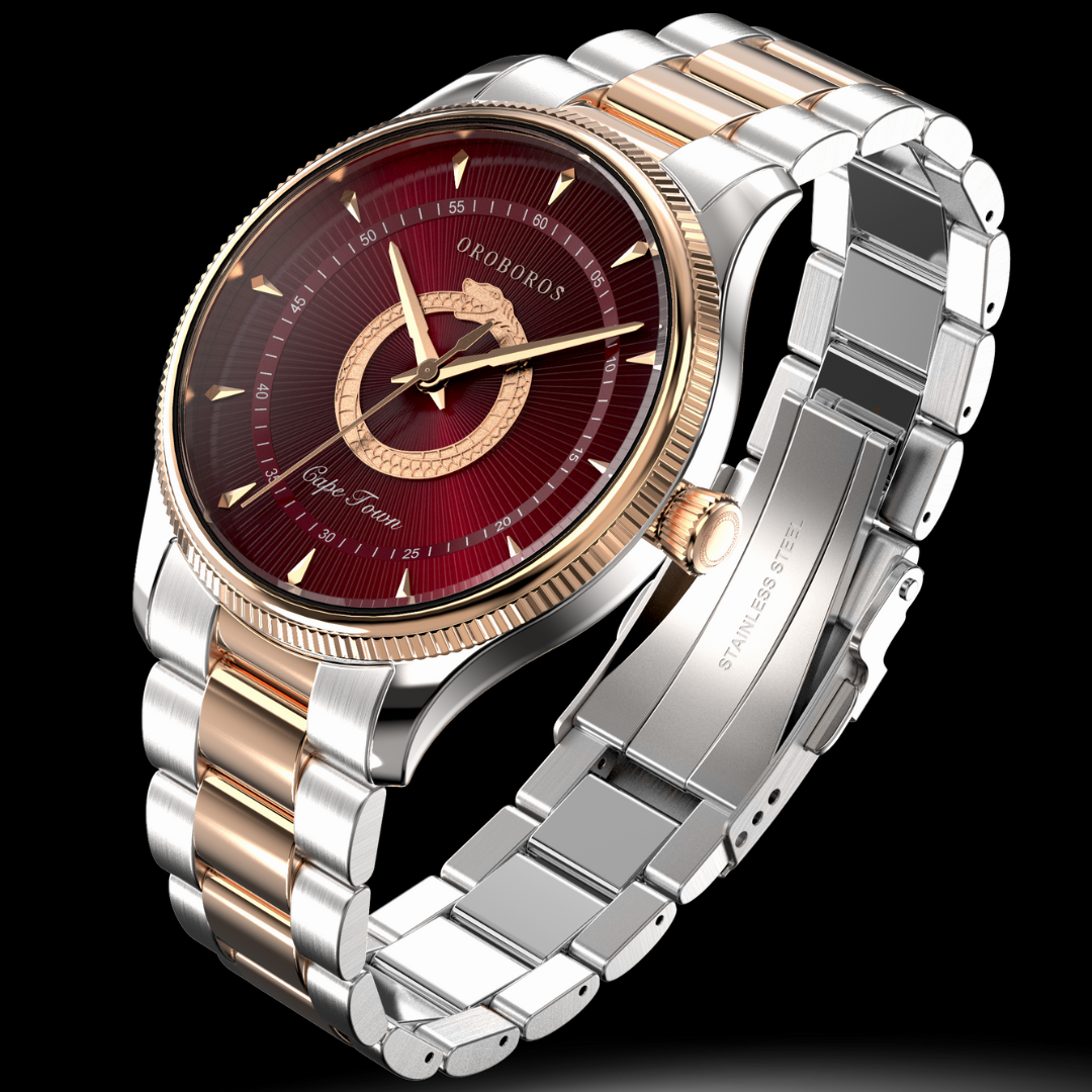 A luxurious timepiece designed in tribute to the vibrant city of Cape Town, South Africa. This watch features a sleek and sophisticated two-tone case and band, combining sleek stainless steel with a rose gold plating for a touch of elegance. The Cape Town features a sleek case that measures 40mm in diameter, a sophisticated bezel design, and is water-resistant up to 5ATM or 50 Meters. The dial of the Cape Town is both classic and contemporary, with a bold, embossed metallic Oroboros at the center of the watch. The sweeping quartz movement and unique dial colors make this watch the perfect accessory for any adventure. So wear this watch with pride, and carry the zealous energy of Cape Town with you wherever you go.