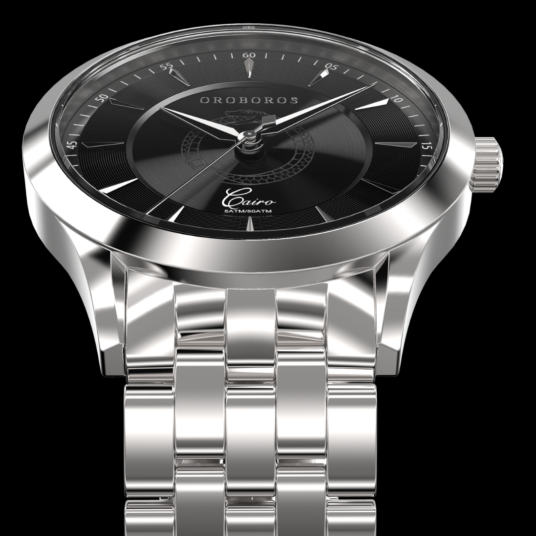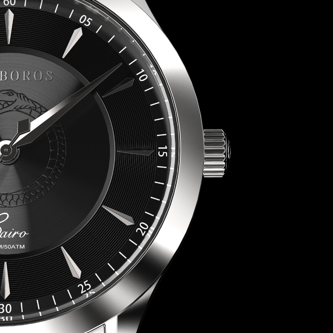 Cairo is a timeless masterpiece inspired by the rich history and cultural heritage of Cairo, Egypt. Crafted with the finest materials and precision engineering, this watch boasts a unique design that pays homage to the beauty & bustle of the city of Cairo. While the 316L stainless steel, PVD plating and, an anti-reflective sapphire crystal provide maximum durability and elegance. The dial portrays a precisely debossed Oroboros snake in the center and comes in a dashing Navy, classy White, or a statement Black. While not a diver watch, the limited edition piece is water resistant up to 50 meters.. So whether you're casually exploring the streets of Cairo, New York, or dressing up for a special occasion in your city, the ‘Cairo Collection' is the perfect accessory to elevate your style.