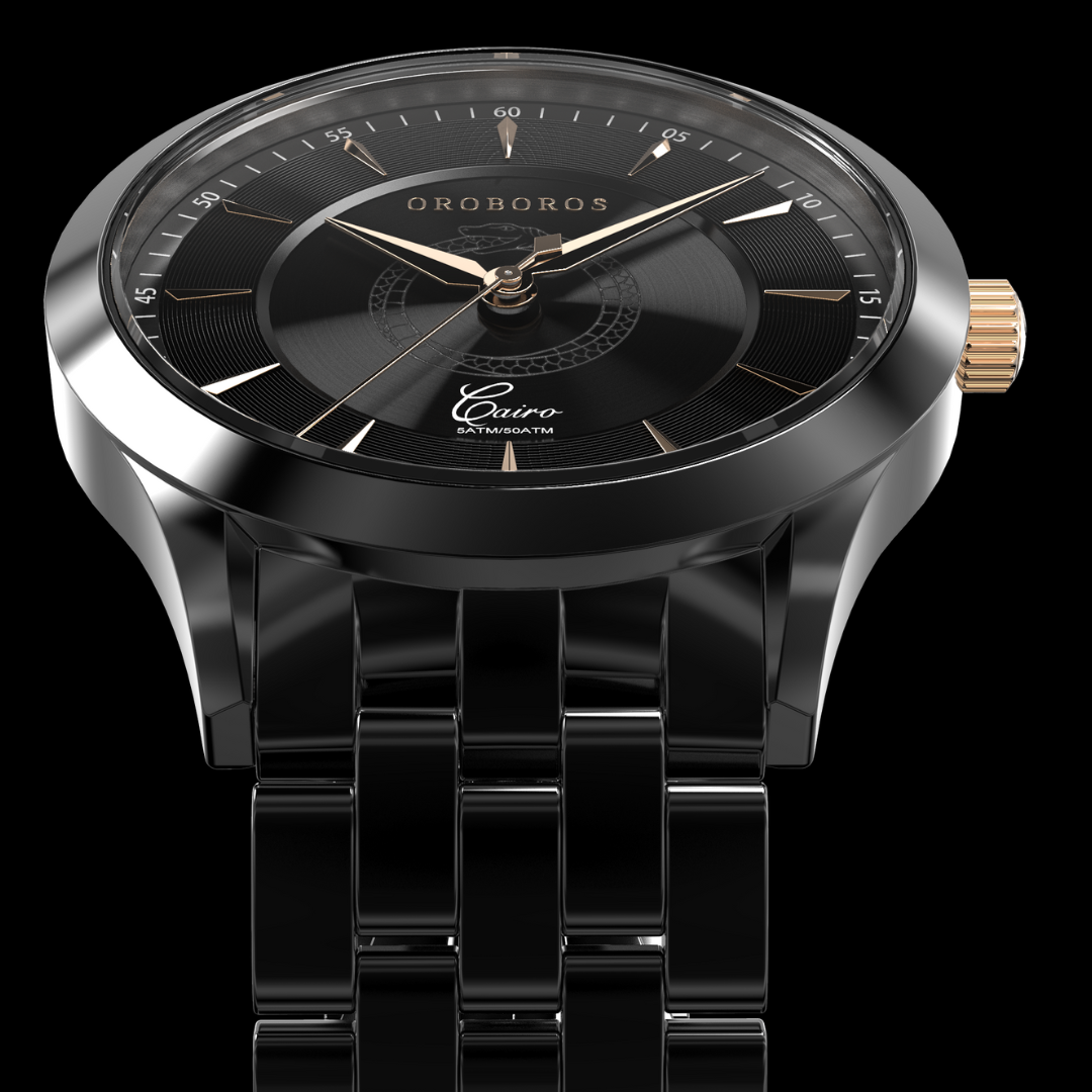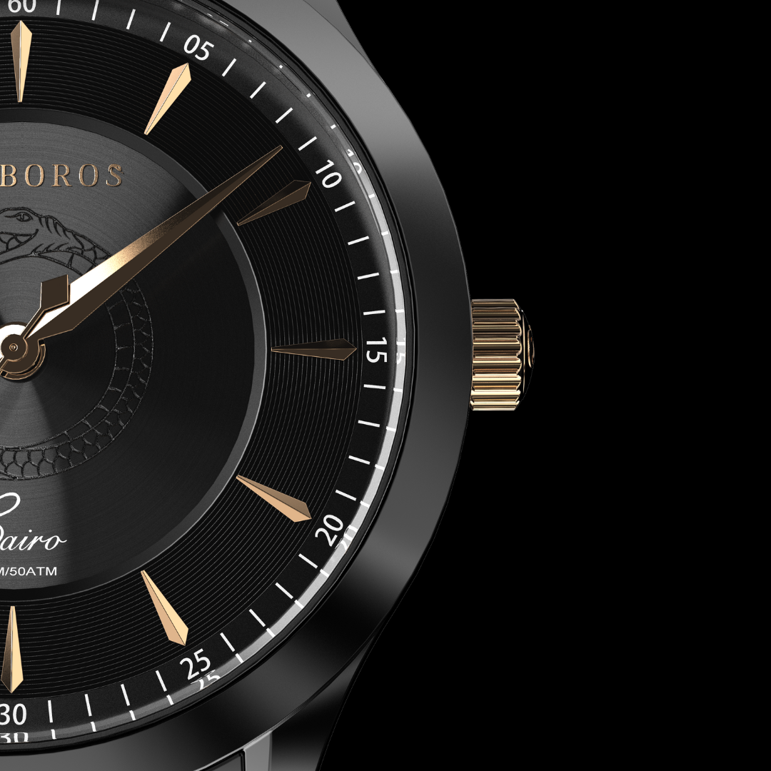 Cairo is a timeless masterpiece inspired by the rich history and cultural heritage of Cairo, Egypt. Crafted with the finest materials and precision engineering, this watch boasts a unique design that pays homage to the beauty & bustle of the city of Cairo. While the 316L stainless steel, PVD plating and, an anti-reflective sapphire crystal provide maximum durability and elegance. The dial portrays a precisely debossed Oroboros snake in the center and comes in a dashing Navy, classy White, or a statement Black. While not a diver watch, the limited edition piece is water resistant up to 50 meters.. So whether you're casually exploring the streets of Cairo, New York, or dressing up for a special occasion in your city, the ‘Cairo Collection' is the perfect accessory to elevate your style.