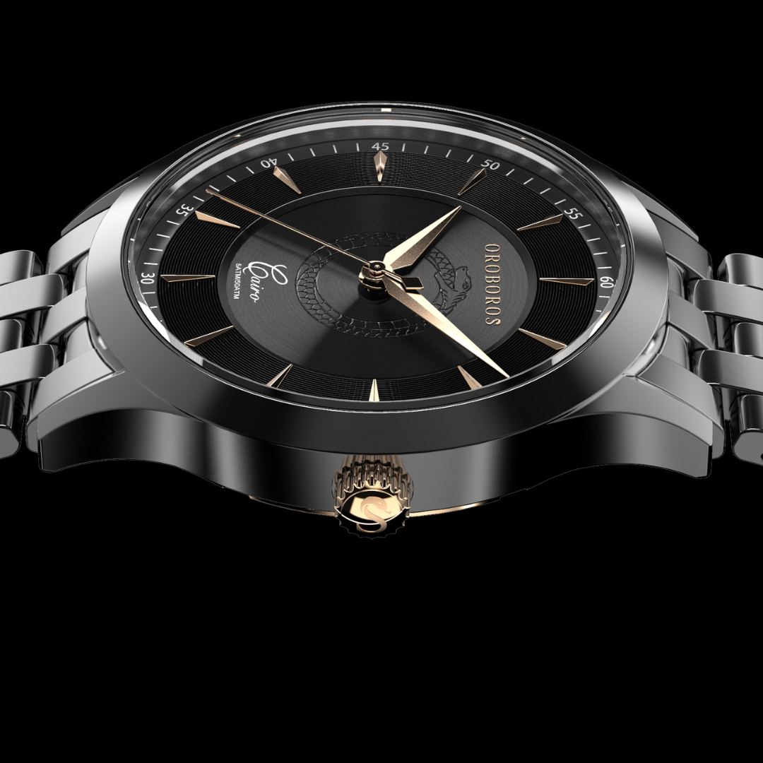 The two tier dial features a concentric circular pattern as well as an intricate debossed Oroboros at the center.