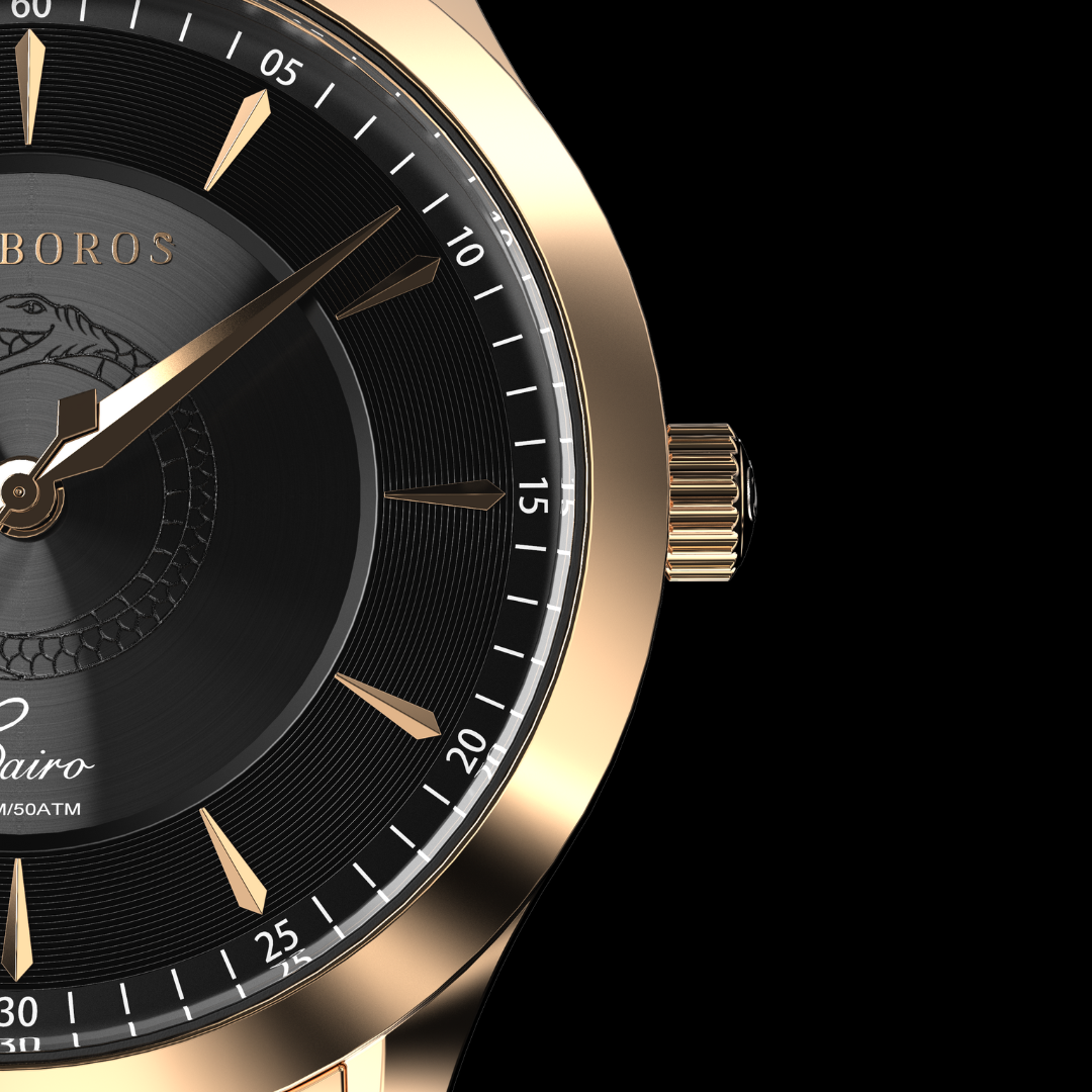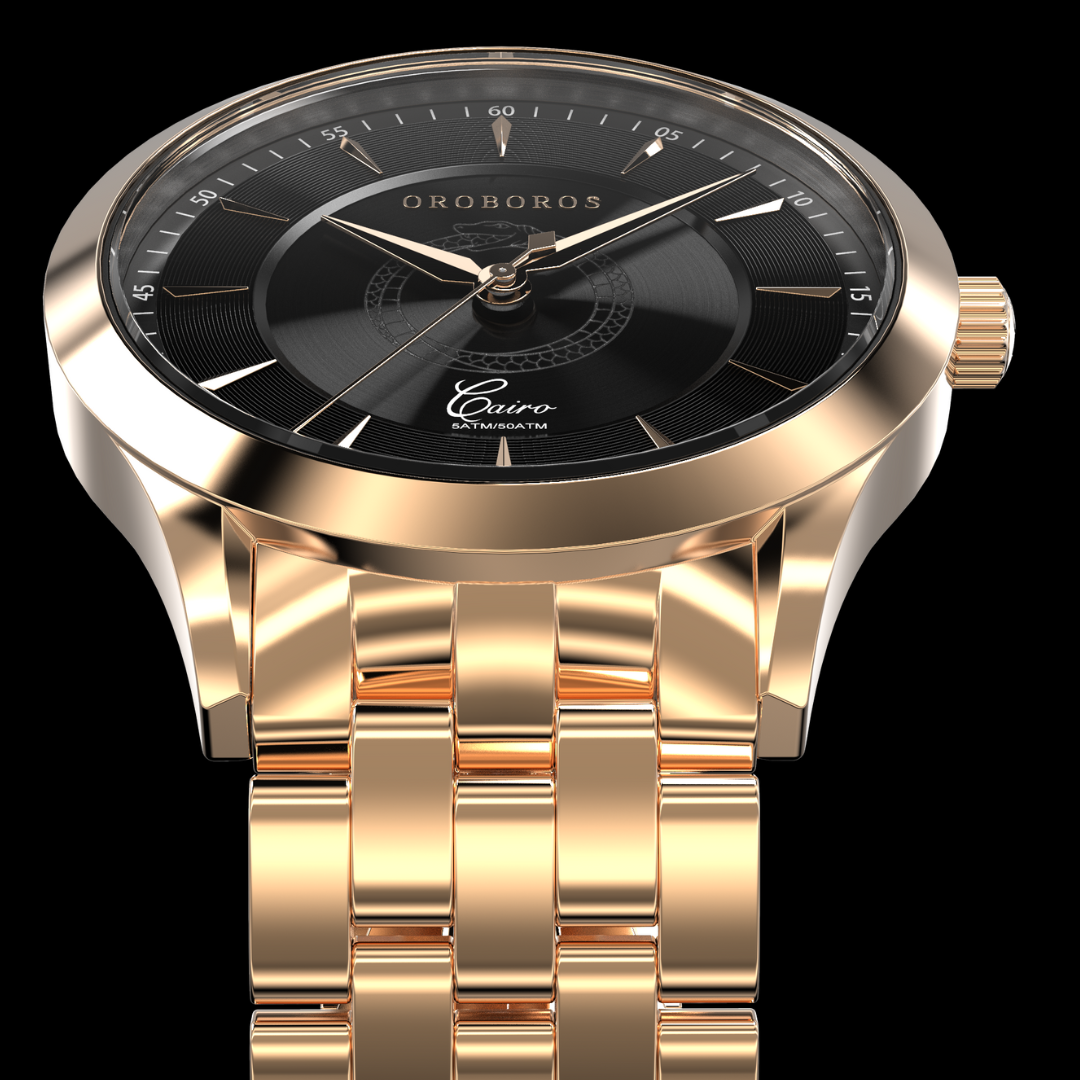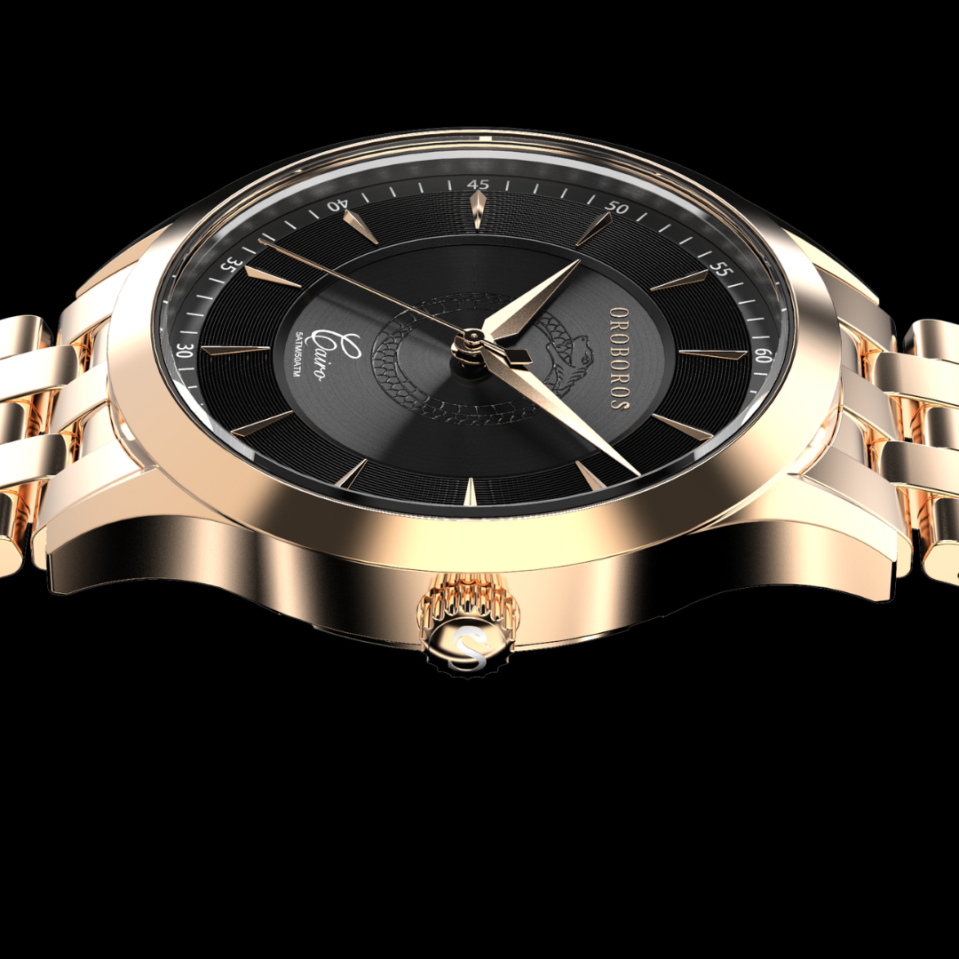 Cairo is a timeless masterpiece inspired by the rich history and cultural heritage of Cairo, Egypt. Crafted with the finest materials and precision engineering, this watch boasts a unique design that pays homage to the beauty & bustle of the city of Cairo. While the 316L stainless steel, PVD plating and, an anti-reflective sapphire crystal provide maximum durability and elegance. The dial portrays a precisely debossed Oroboros snake in the center and comes in a dashing Navy, classy White, or a statement Black. While not a diver watch, the limited edition piece is water resistant up to 50 meters.. So whether you're casually exploring the streets of Cairo, New York, or dressing up for a special occasion in your city, the ‘Cairo Collection' is the perfect accessory to elevate your style.