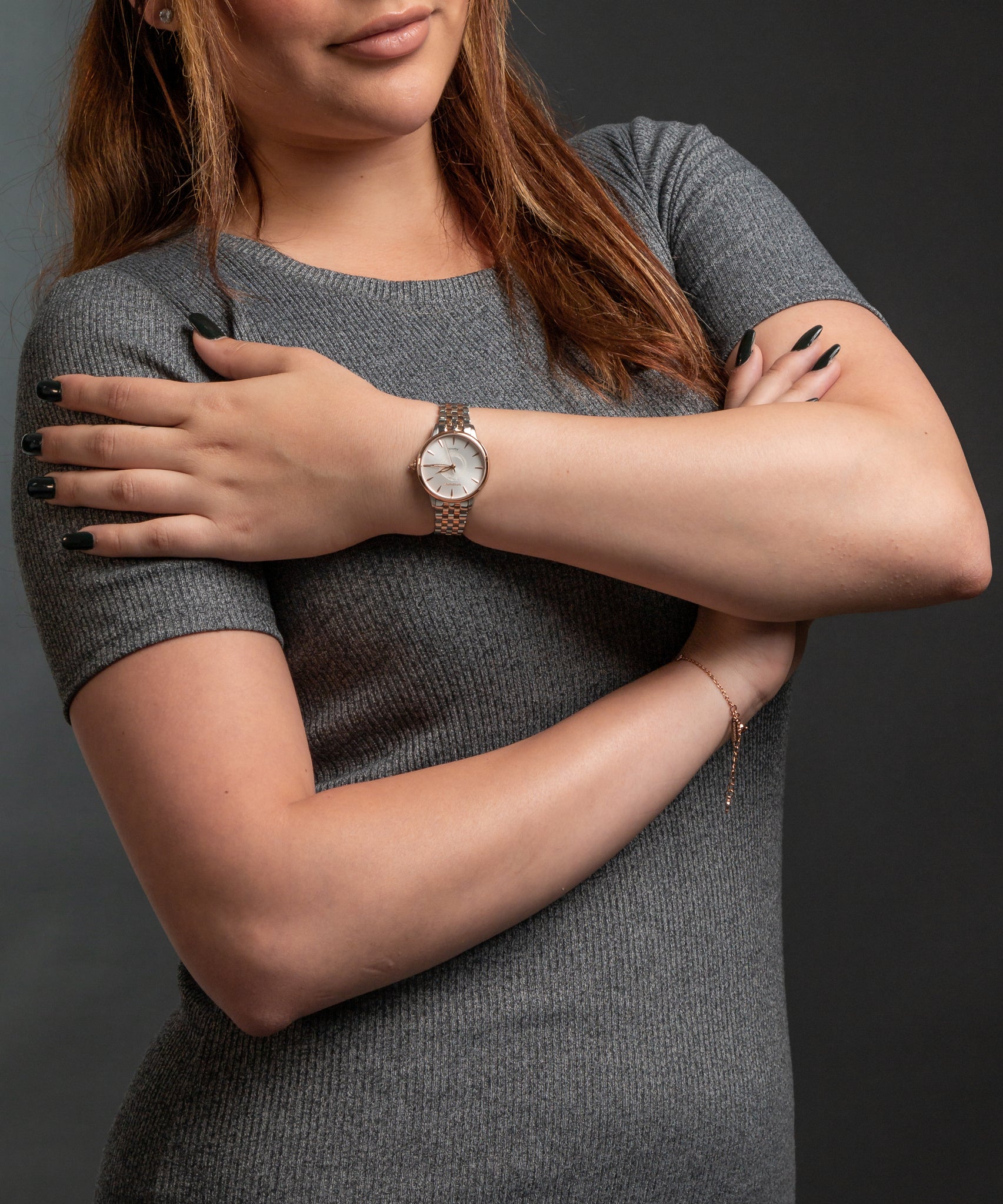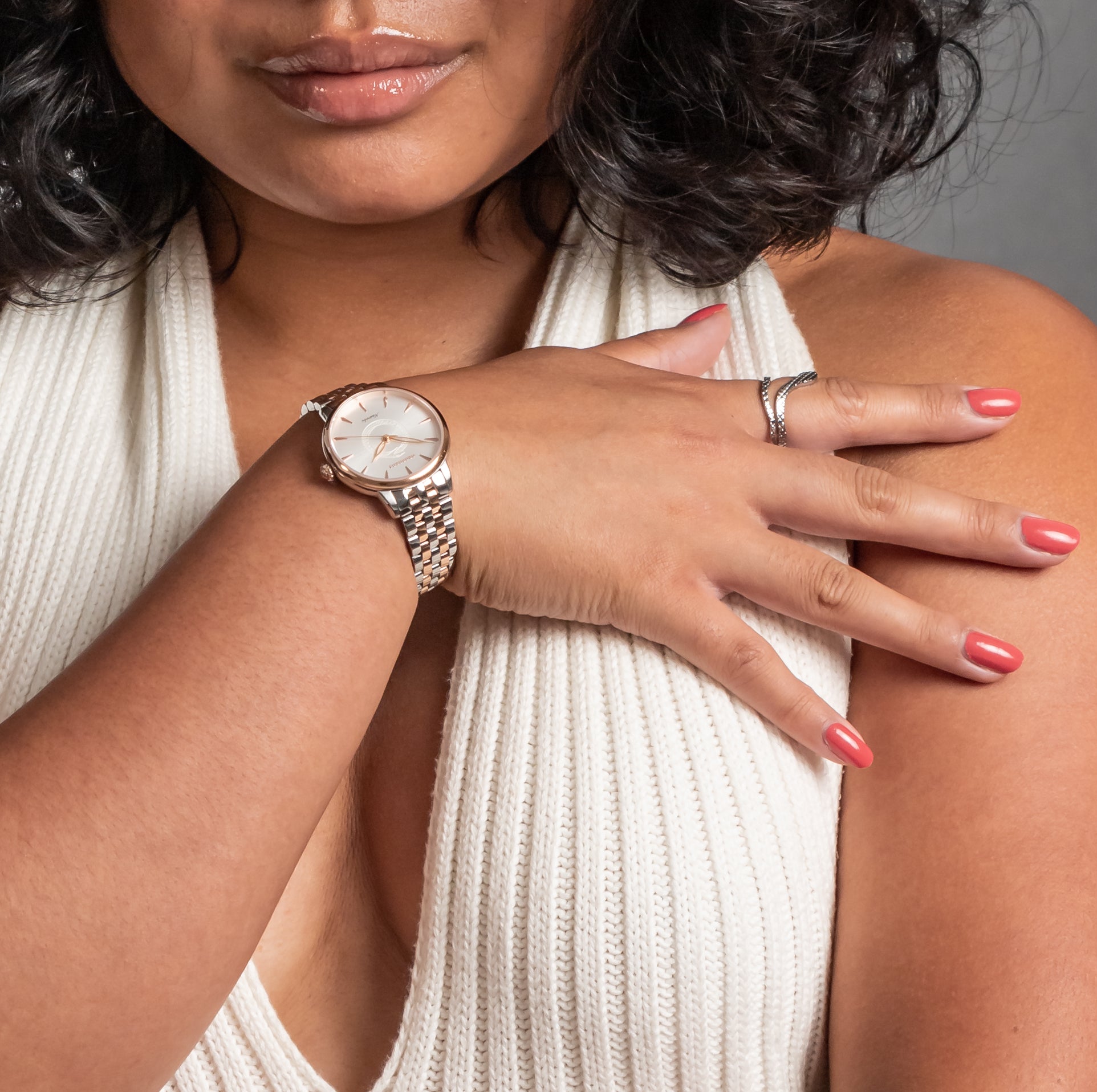 This luxurious timepiece is designed in tribute to the capital city of Kenya and one of Africa's fastest growing cities. This watch features a sleek and vibrant two-tone case and band, combining silver and rose gold plating for a touch of elegance & beauty. Powered by a Swiss quartz movement, Nairobi ensures accurate timekeeping and reliable performance. Meanwhile the 316L stainless steel, PVD plating and an anti-reflective sapphire crystal ensure tarnish resistance and maximum durability. The minimalist dial portrays a precisely debossed Oroboros in the center and comes in a classy White or a statement Black. So whether you’re dressing up for an occasion or casually strolling in the city, our Nairobi timepiece is the perfect finishing touch to elevate any outfit.